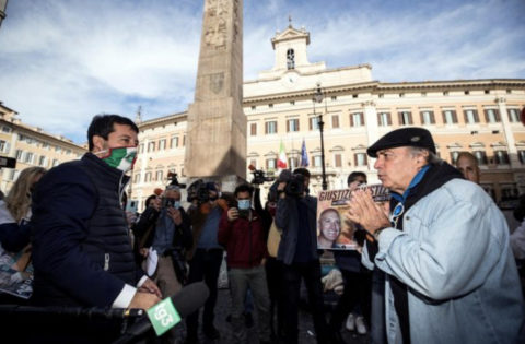Montesano in piazza con Salvini senza mascherina. Fermato dalla polizia: “Non respiro, fa malee”
